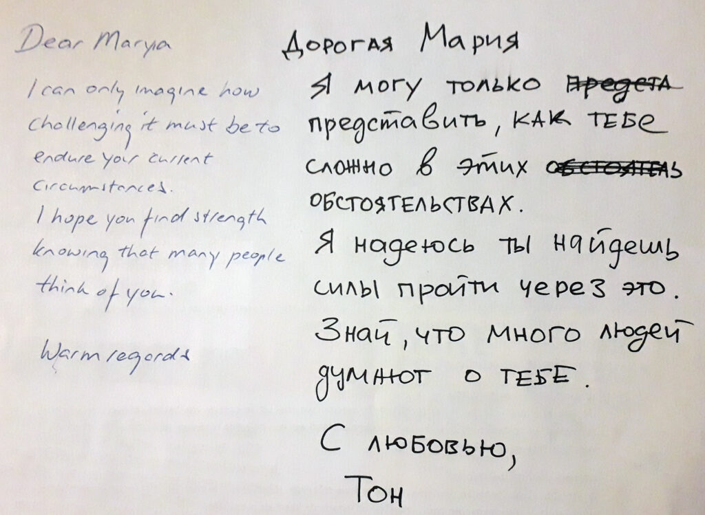 Ik hoop dat ze snel vrij komt en teken een vlinder en een paar muzieknoten op de kaart die naar haar gaat. De tekst moet in het Russisch, want anders komt die niet aan. Er is vandaag een Oekraïense vrouw in de koepel aanwezig die je helpt jouw tekst om te zetten.