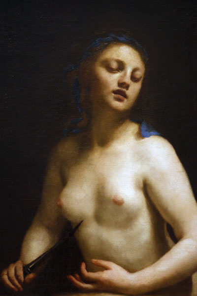 De onteerde Lucretia pleegt zelfmoord in Rome, ongeveer 500 v. Chr., schilder is Guido Cagnacci