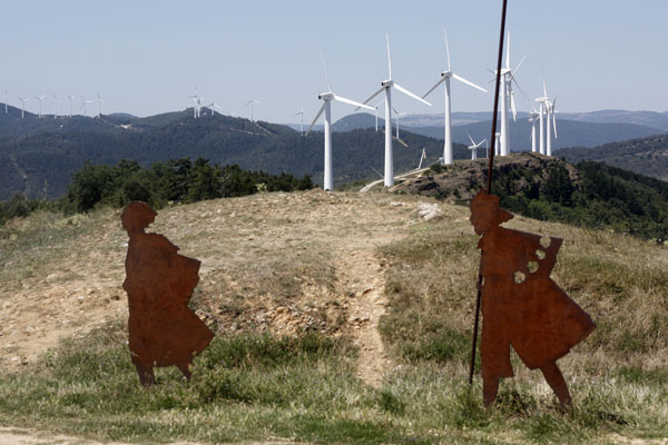 Veel wind op de top van El Perdón, punt op de pelgrimsroute naar Santiago